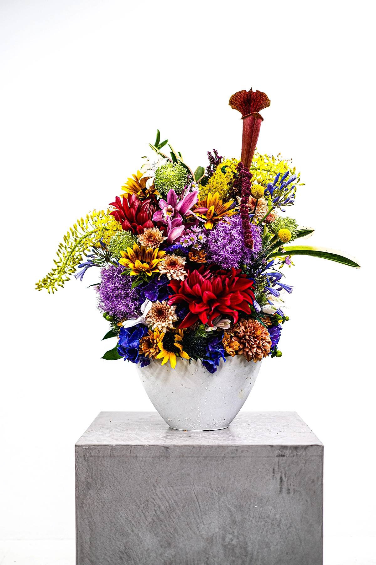 ミュージシャンからラジオ局へ贈る、開局記念の華やかなアレンジメント。カラフルな花材を大胆に組み合わせ、個性と独創性が躍動する一品。まるで音波が色を纏ったかのように、明るさとリズムが空間を彩ります。