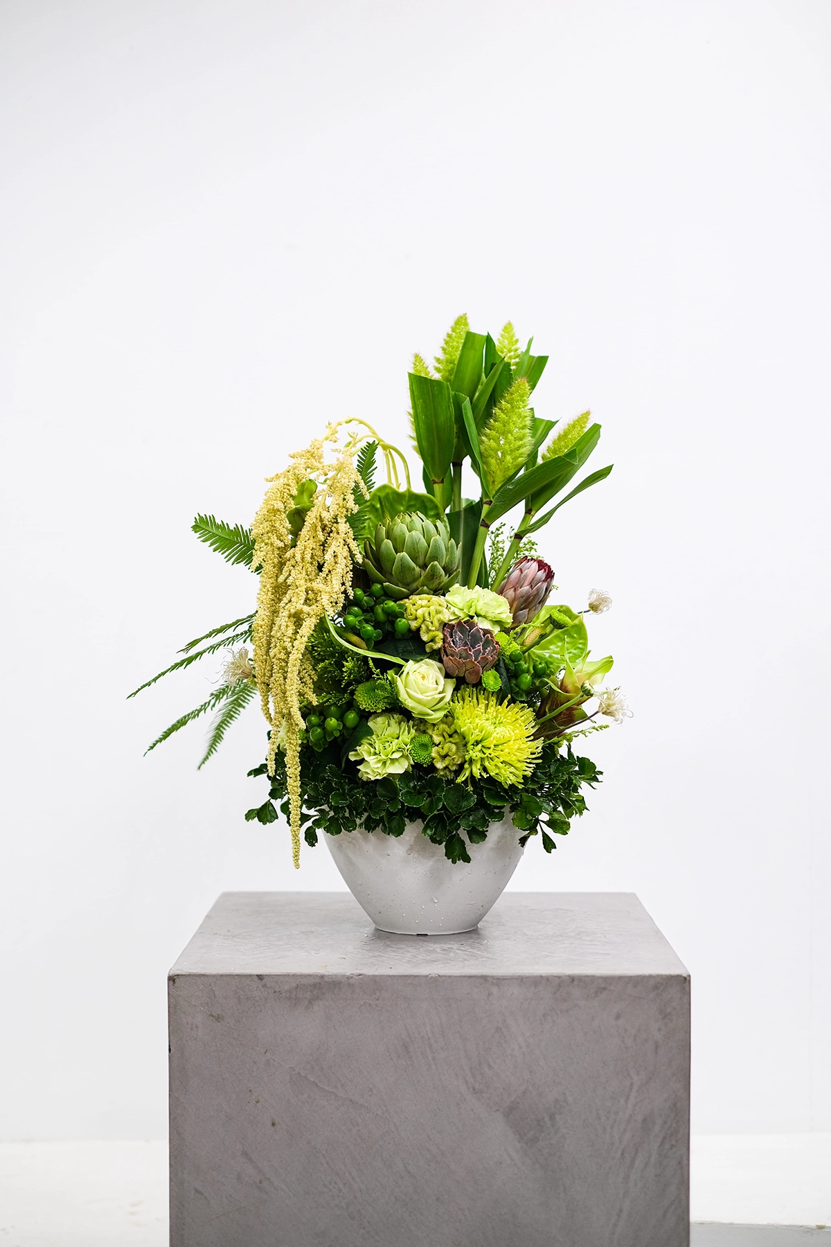 新店オープン祝いとして。清々しくも気品あふれるアレンジメントに。 コーポレートカラーに合わせたグリーンとイエローが、光のごとく空間を満たし、前向きなエネルギーをそっと運びます。晴れやかな門出をより一層引き立てる一品です。